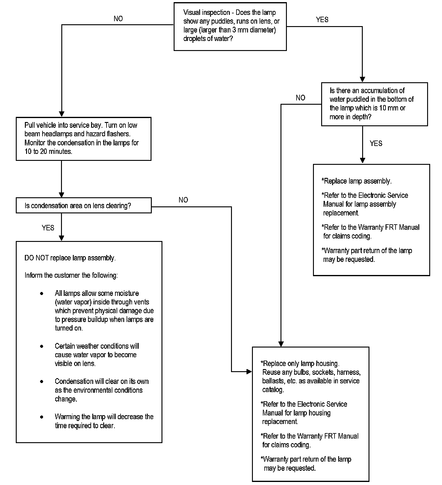 Should a customer note water in a lamp assembly please use the following flow chart to determine if the condition is normal or requires lamp replacement.