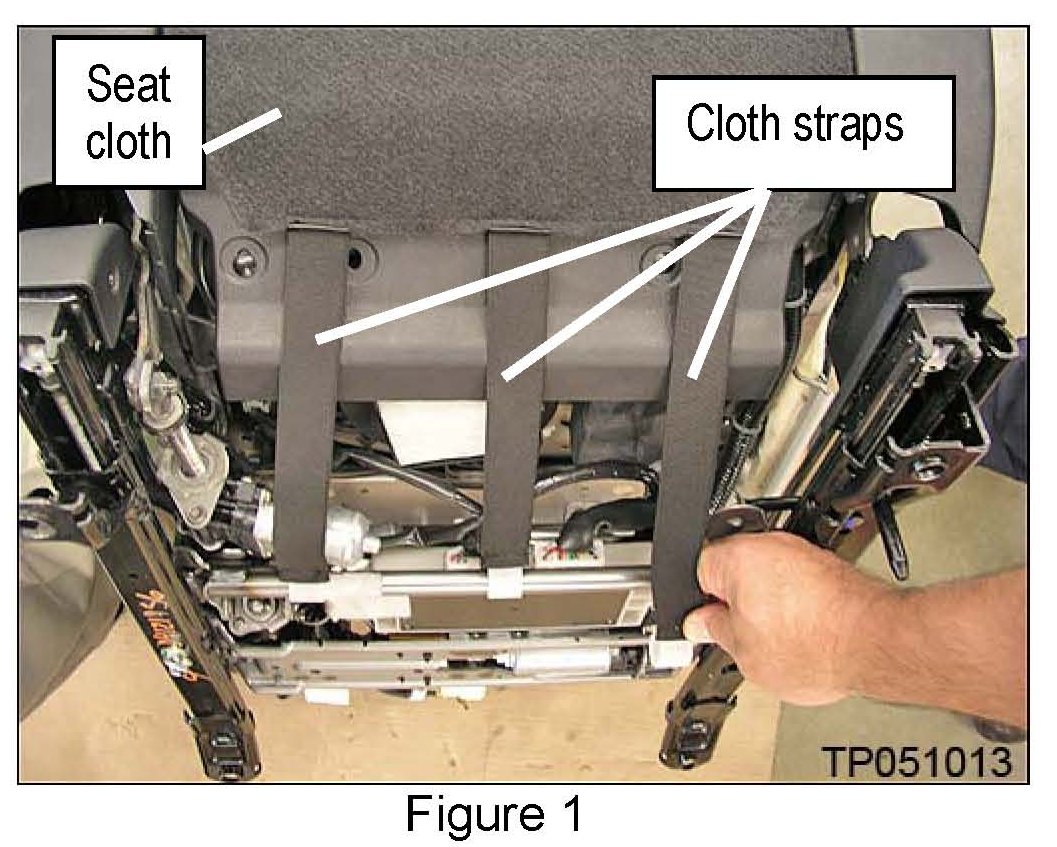 2. From under the seat disconnect the 3 seat cloth straps and fold the seat cloth out of the way.