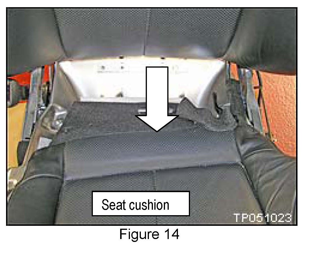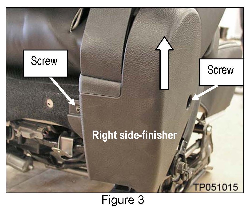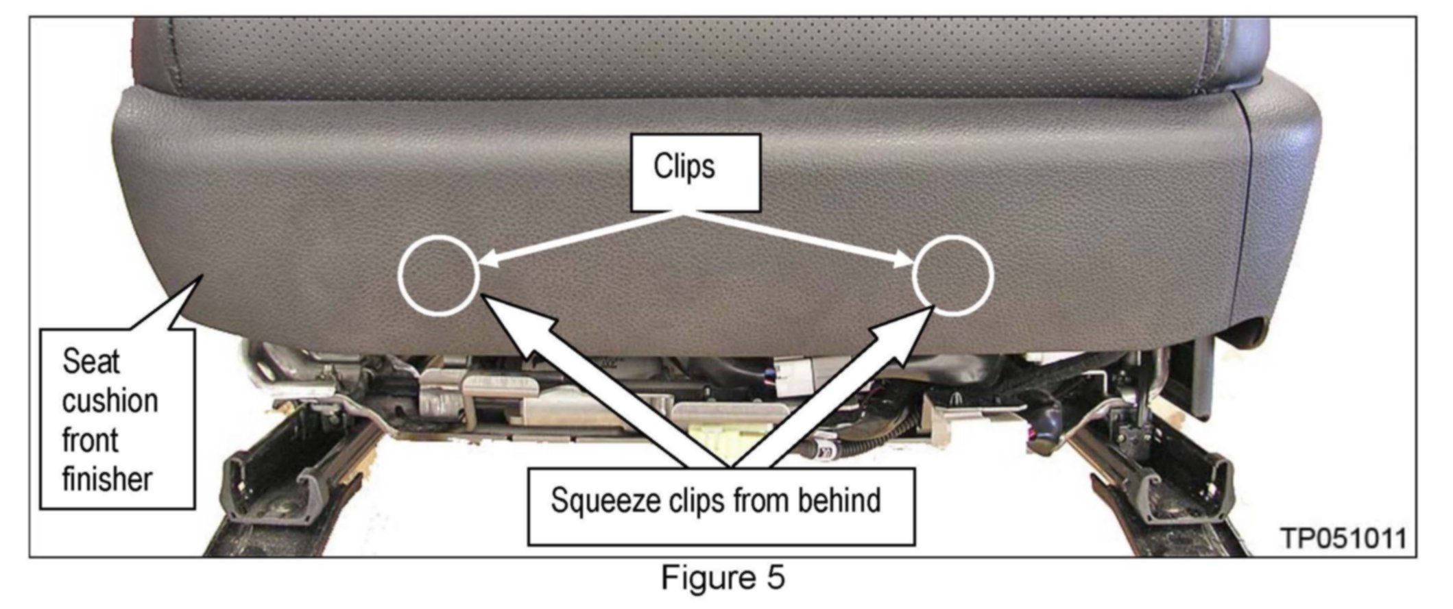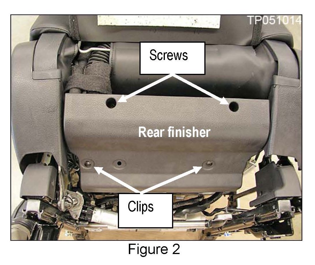 3. If equipped remove the seat cushion rear finisher; 2 screws and 2 clips shown in Figure 2.