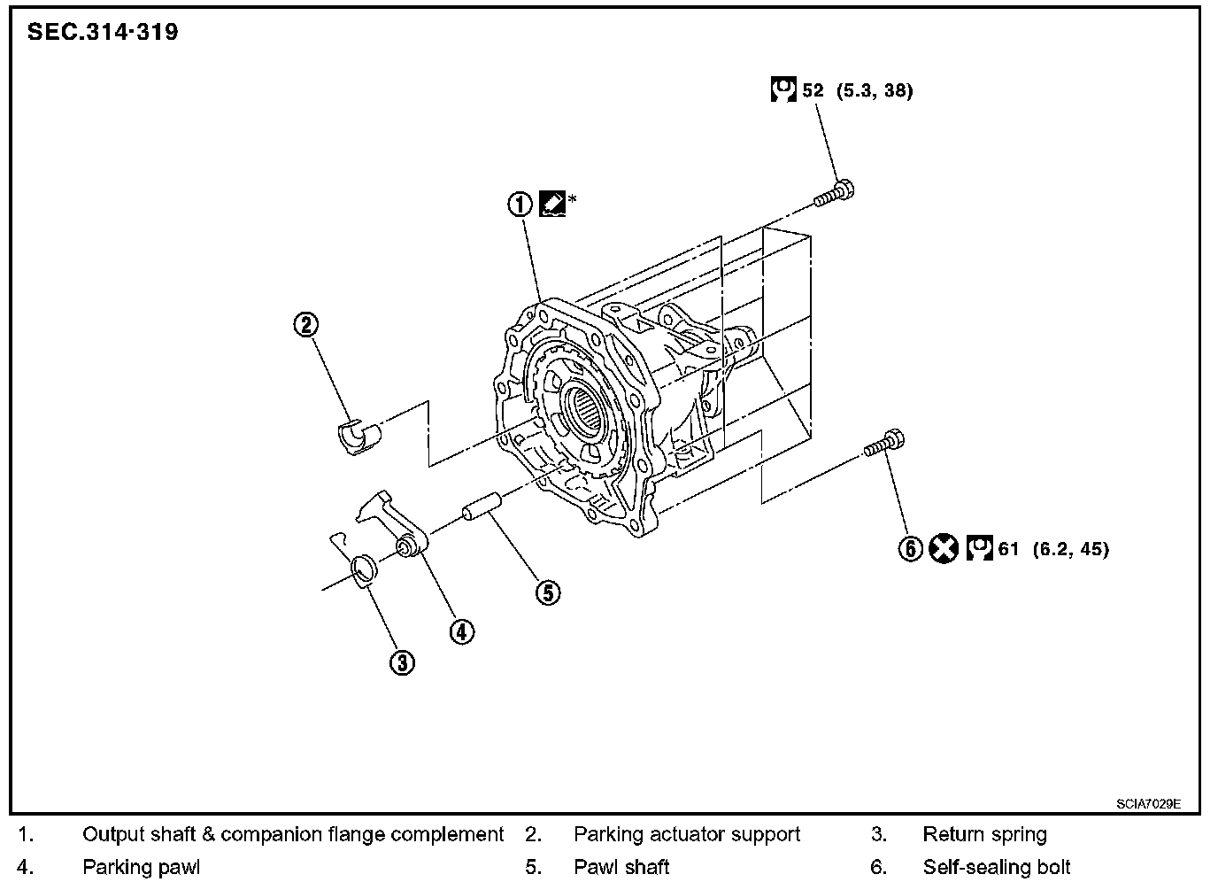 ^ If the contact surface on parking actuator support, parking pawl, etc. has excessive wear, abrasion, bend, or any other damage, replace the components.