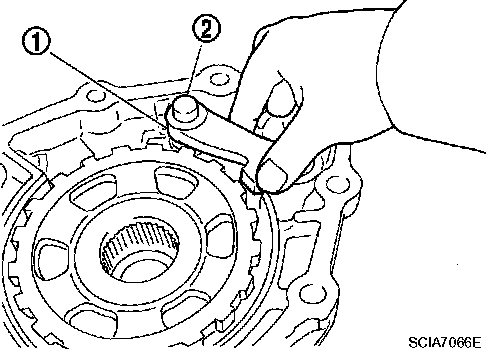 12. Remove parking pawl (with return spring) (1) and pawl shaft (2) from output shaft & companion flange complement.