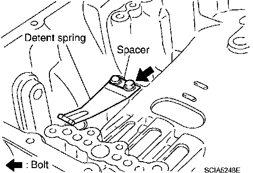 2. Install detent spring and spacer in A/T case. Tighten detent spring and spacer bolts to the specified torque. Refer to "Components".
