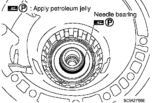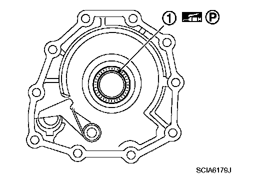 v. Install needle bearing (1) to rear extension (2WD models) or adapter case (AWD models).