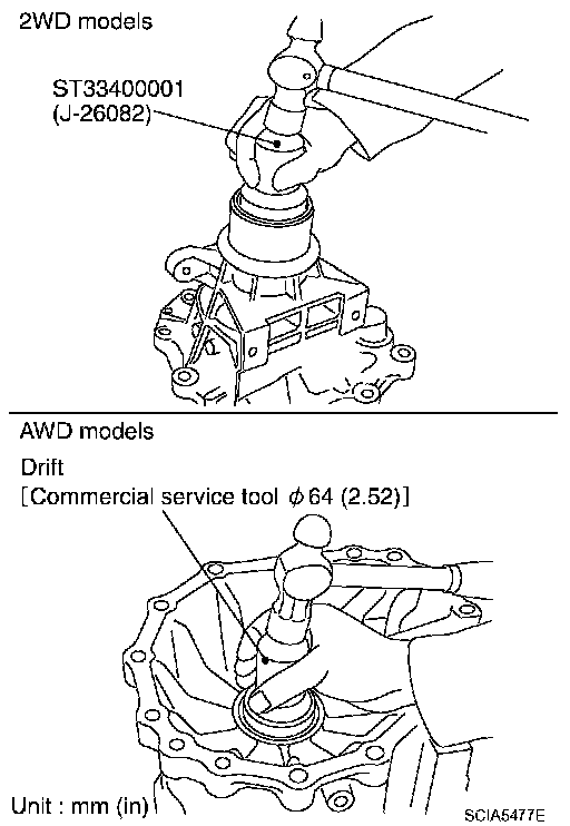 i. As shown in the figure, use the drift to drive rear oil seal into the rear extension (2WD models) or adapter case (AWD models) until it is flush.