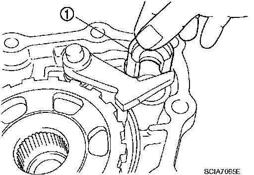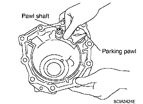 iii. Install parking pawl (with return spring) and pawl shaft to rear extension (2WD models) or adapter case (AWD models).