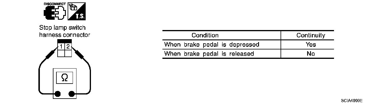 - Check continuity between stop lamp switch harness connector E124 terminals 1 and 2