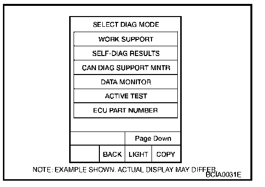 7. Select diagnosis mode. "ACTIVE TEST", "WORK SUPPORT" and "DATA MONITOR" are available.