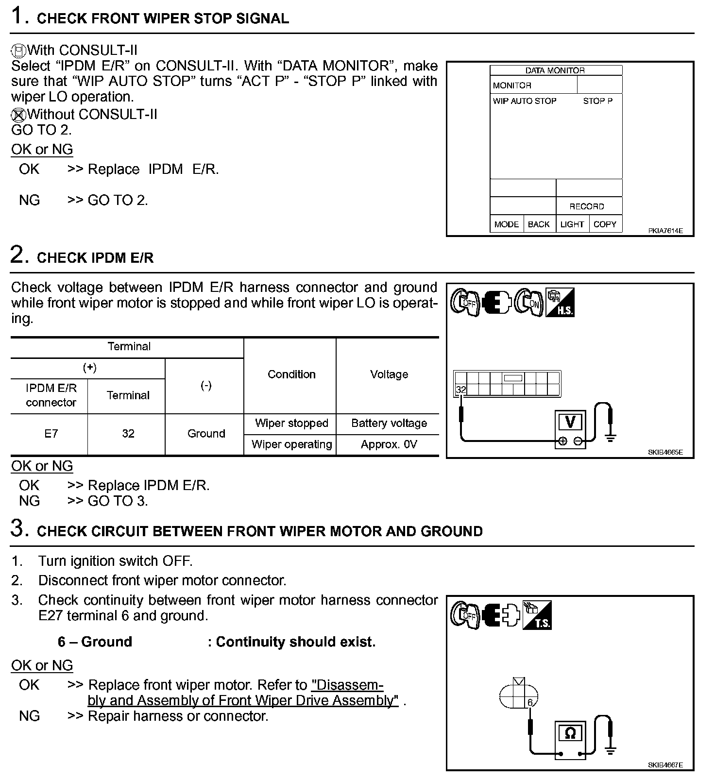 - When auto stop signal has not varied for 10 seconds or longer while IPDM E/R is operating front wipers, IPDM E/R considers that front wipers are locked, and stops wiper output. That causes this symptom.