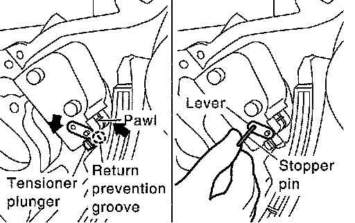 a. Press tab in the direction of arrow (or turn lever in the direction of arrow) to unlock the locking with the groove that stops tensioner plunger from returning.
