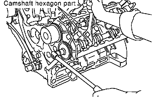 15. With hexagonal part of camshaft locked with wrench, loosen bolts securing camshaft sprocket to remove camshaft sprocket.