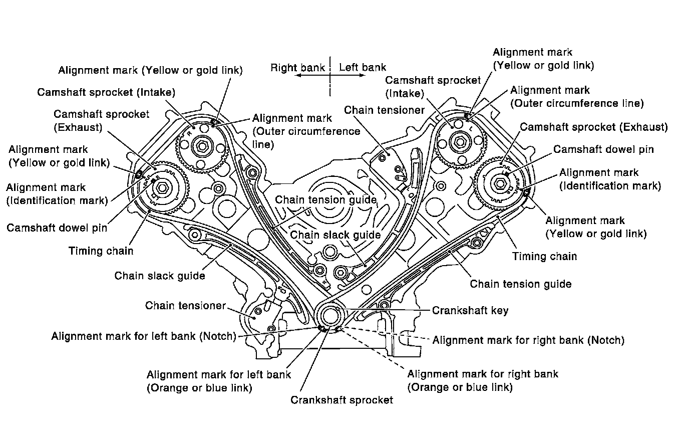 ^ The above figure shows the relationship between the mating mark on each timing chain and that on the corresponding sprocket, with the components installed.