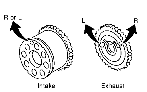 ^ Install exhaust side camshaft sprocket by selectively using the groove of dowel pin according to the bank. (Common part used for both banks.)