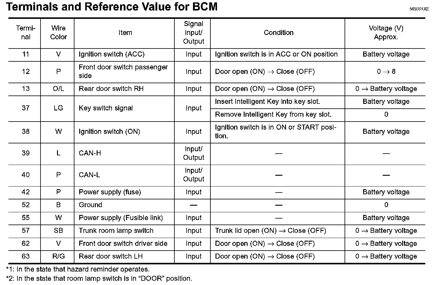 Terminals And Reference Value For BCM:
