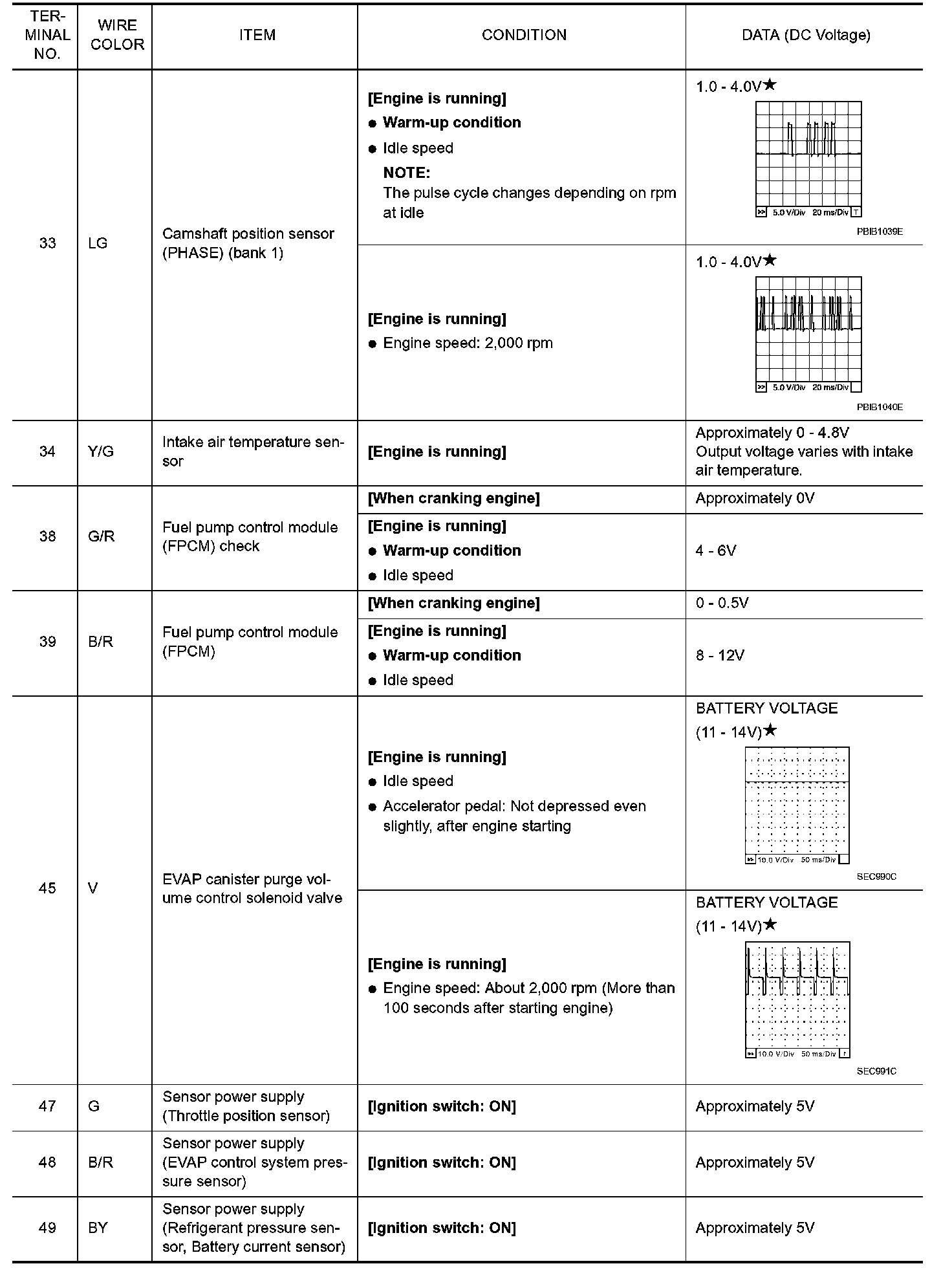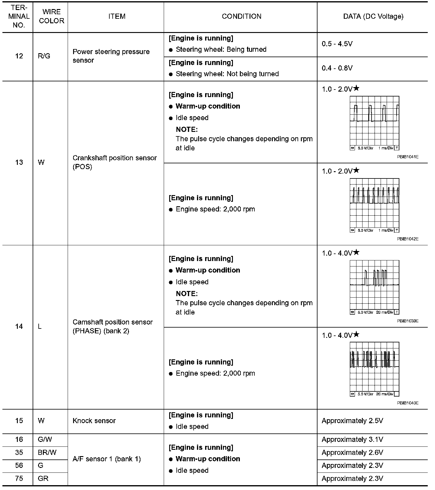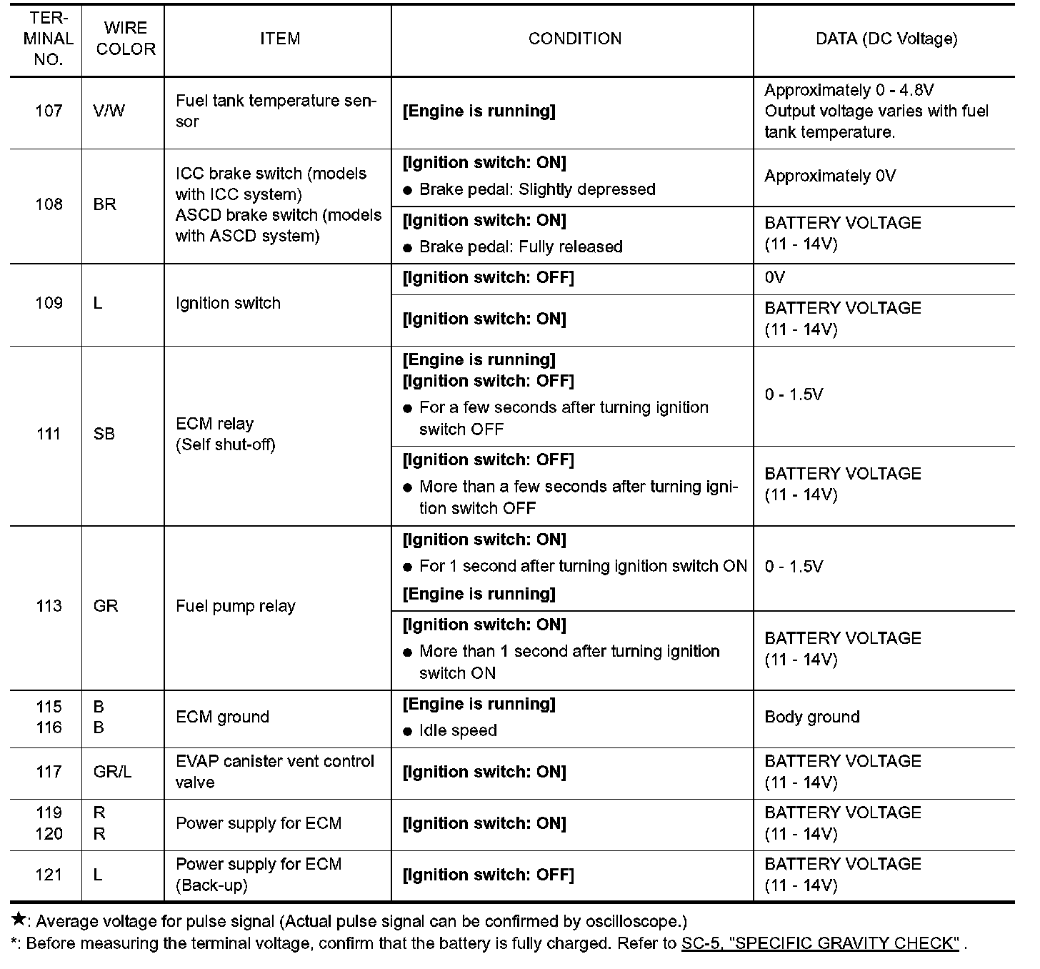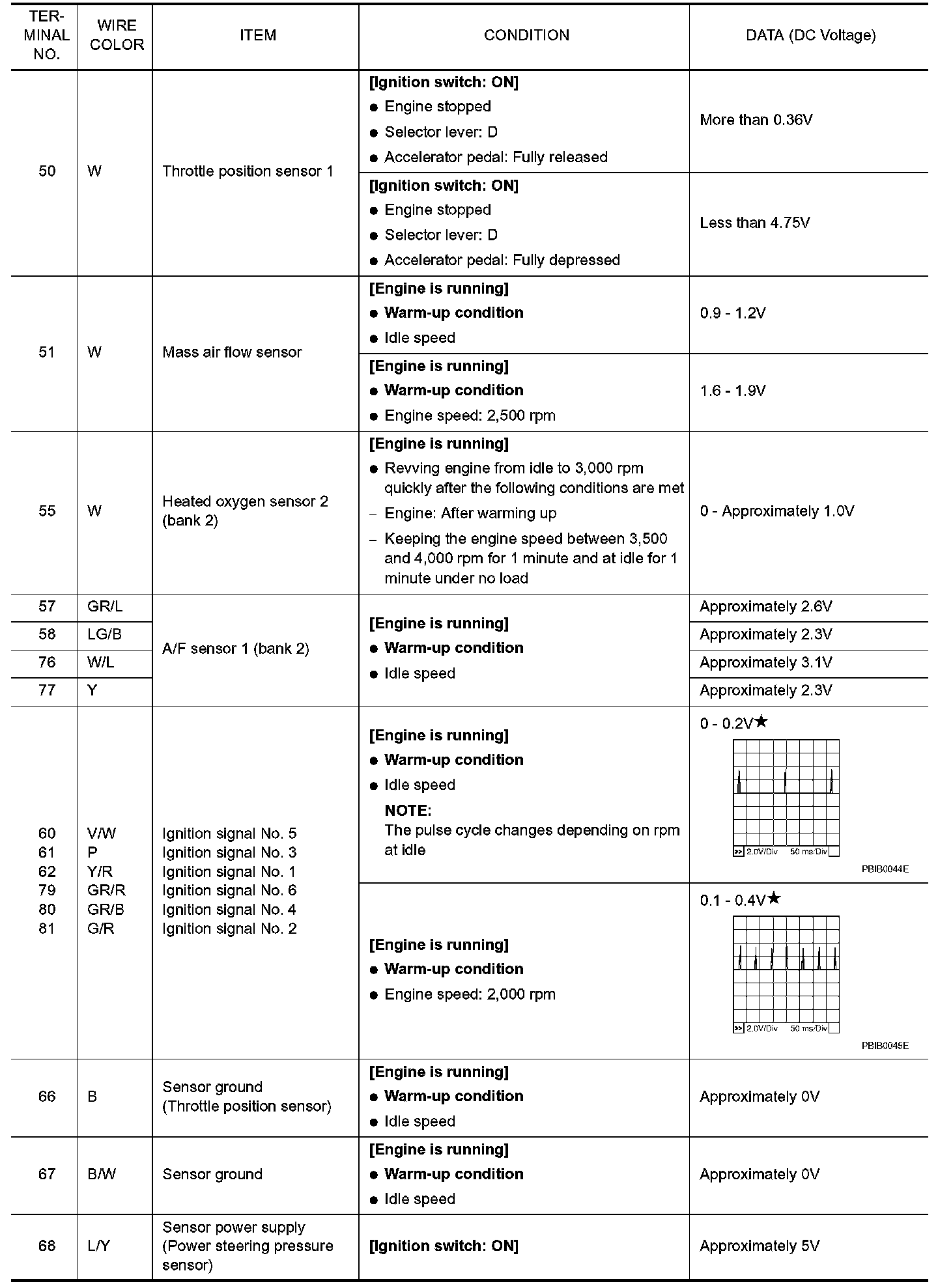 Specification data are reference values and are measured between each terminal and ground. Pulse signal is measured by CONSULT-II.