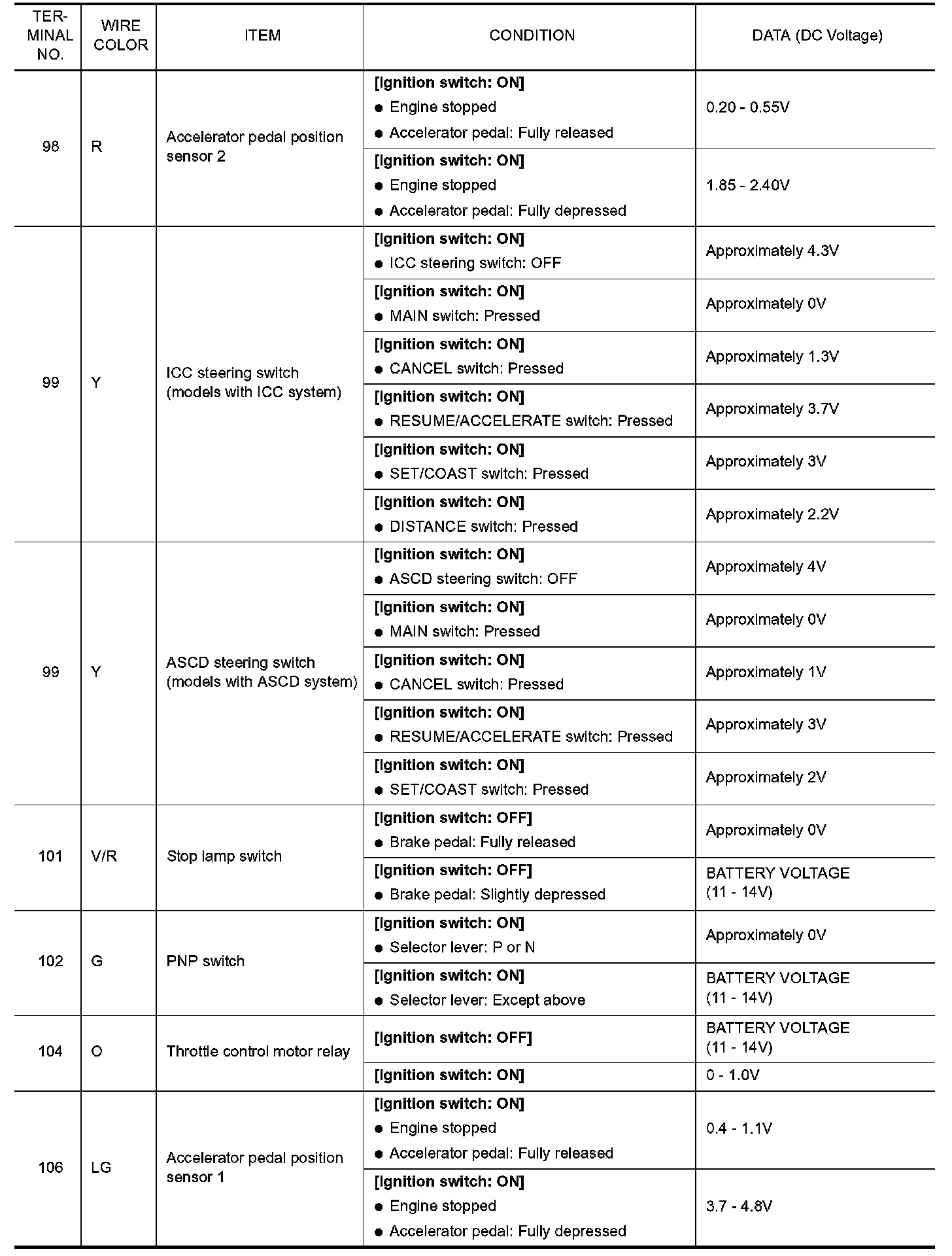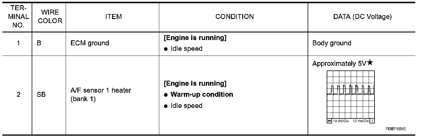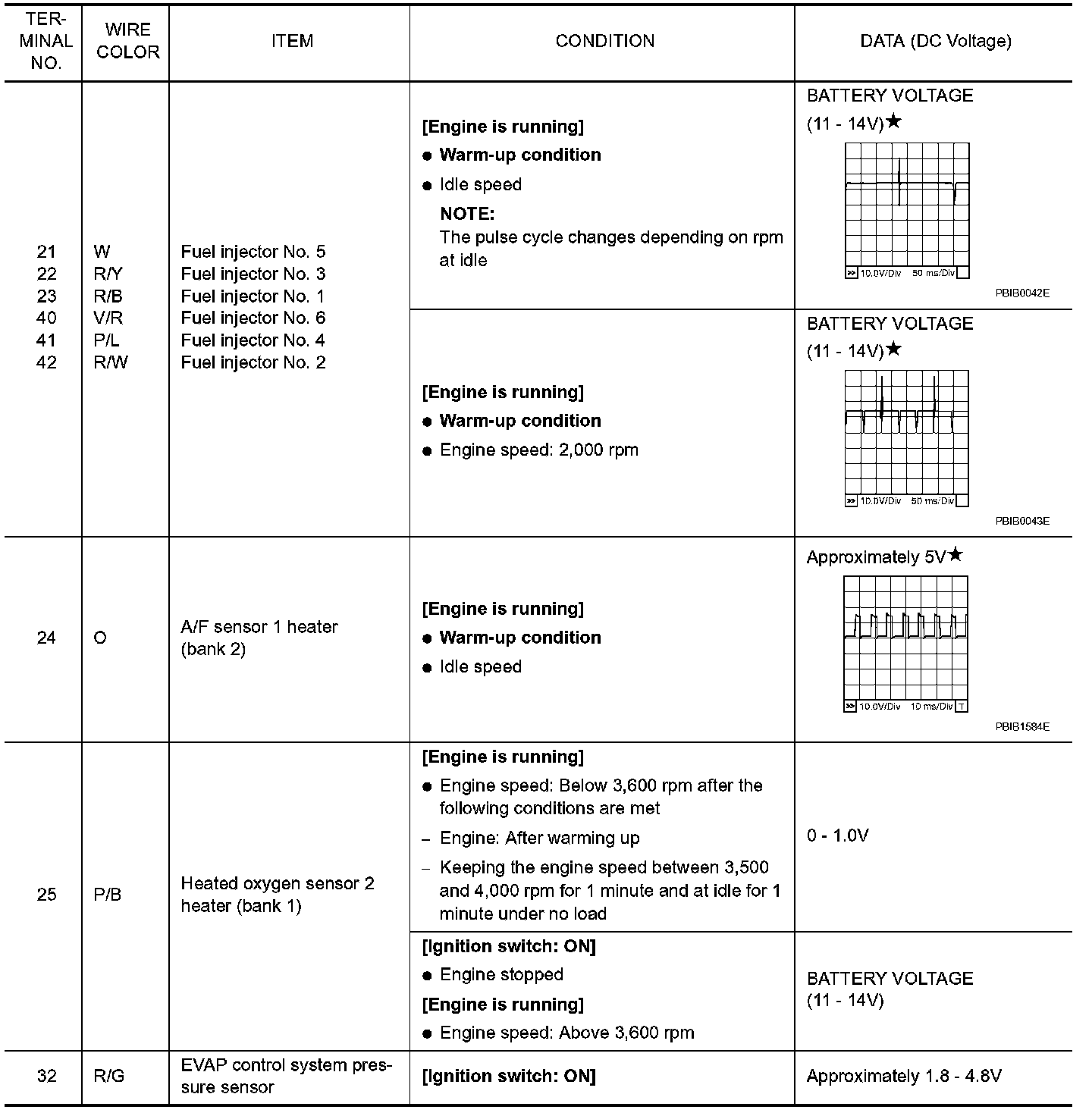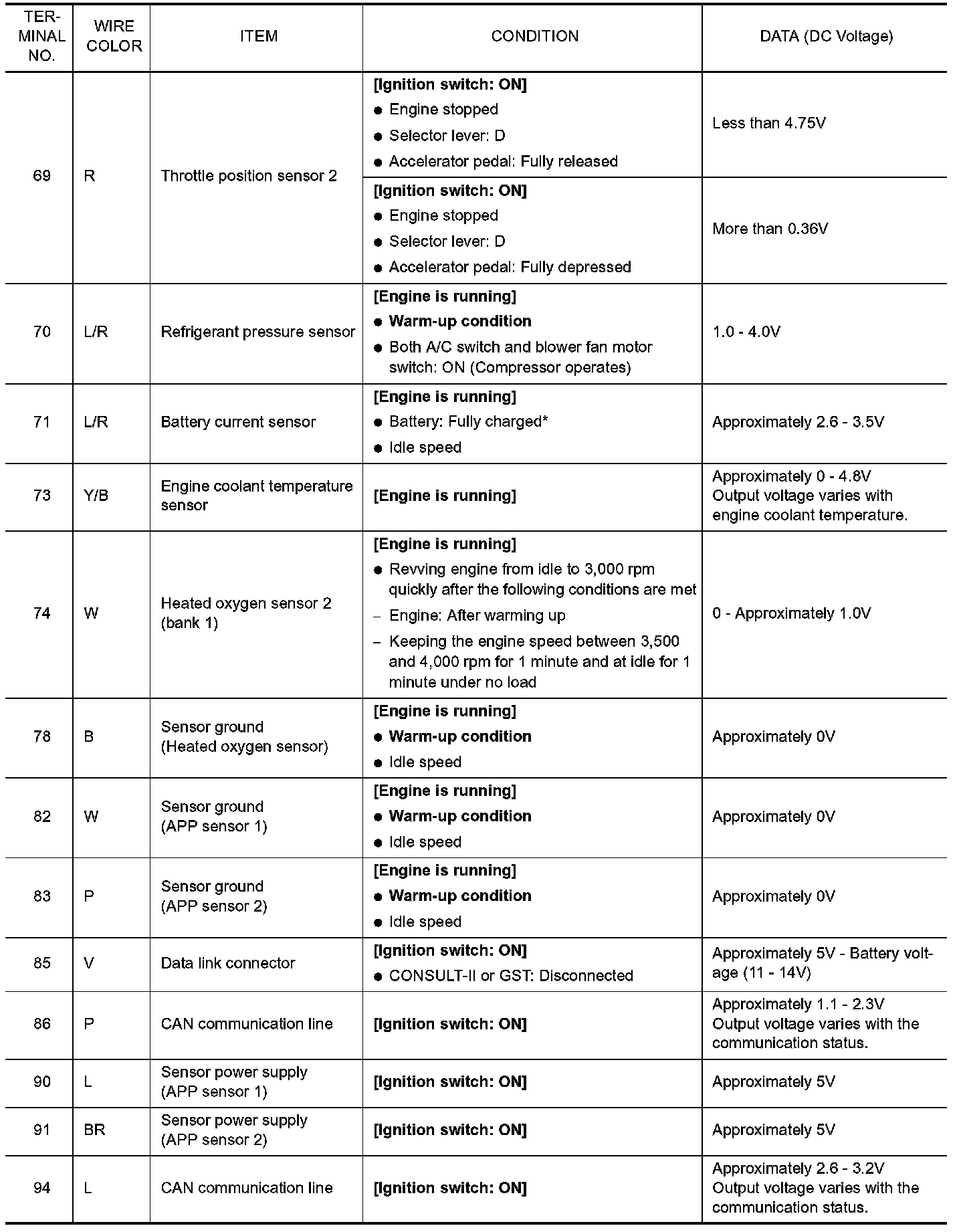 Specification data are reference values and are measured between each terminal and ground. Pulse signal is measured by CONSULT-II.