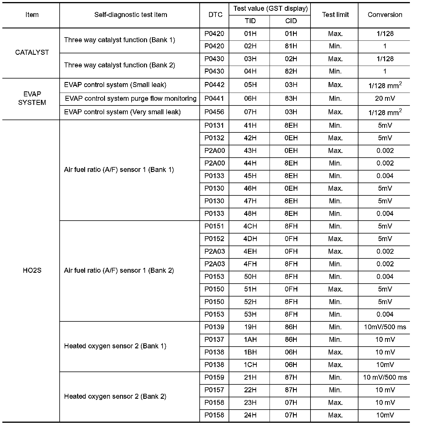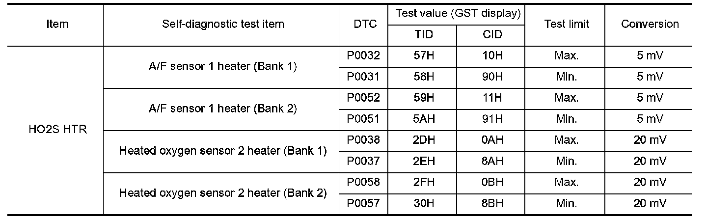 The test value is a parameter used to determine whether a system/circuit diagnostic test is OK or NG while being monitored by the ECM during self-diagnosis. The test limit is a reference value which is specified as the maximum or minimum value and is compared with the test value being monitored.