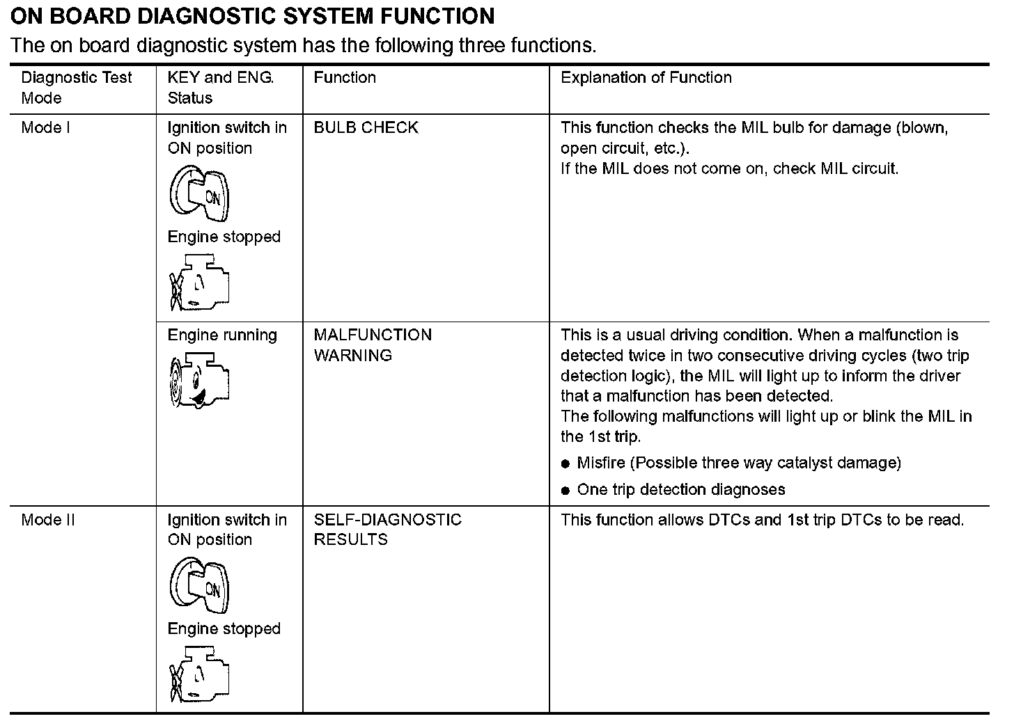 Therefore, when electrical controlled throttle and part of ECM related diagnosis are continuously detected as NG for 5 trips, ECM warns the driver that engine control system malfunctions and MIL circuit is open by means of operating fail-safe function.
