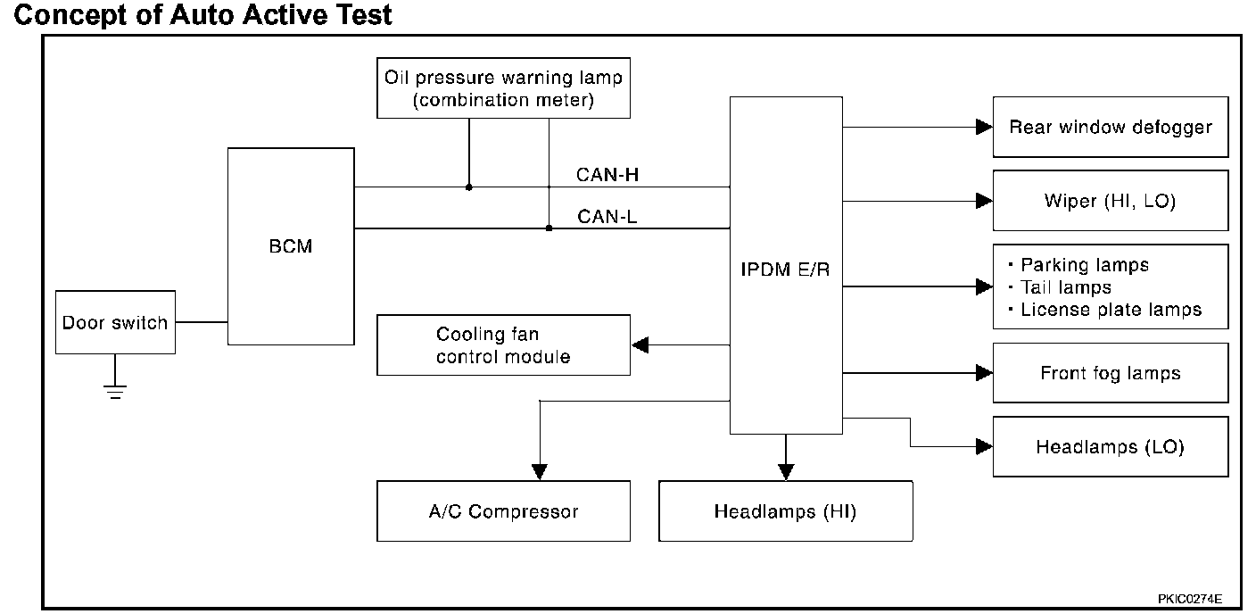 - IPDM E/R actuates auto active test mode when it receives door switch signal from BCM via CAN communication line. Therefore, when auto active test mode is activated successfully, CAN communication between IPDM E/R and BCM is normal.