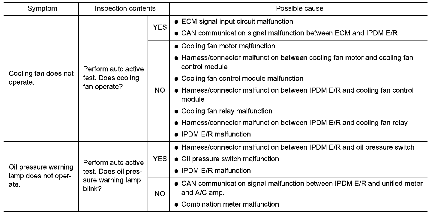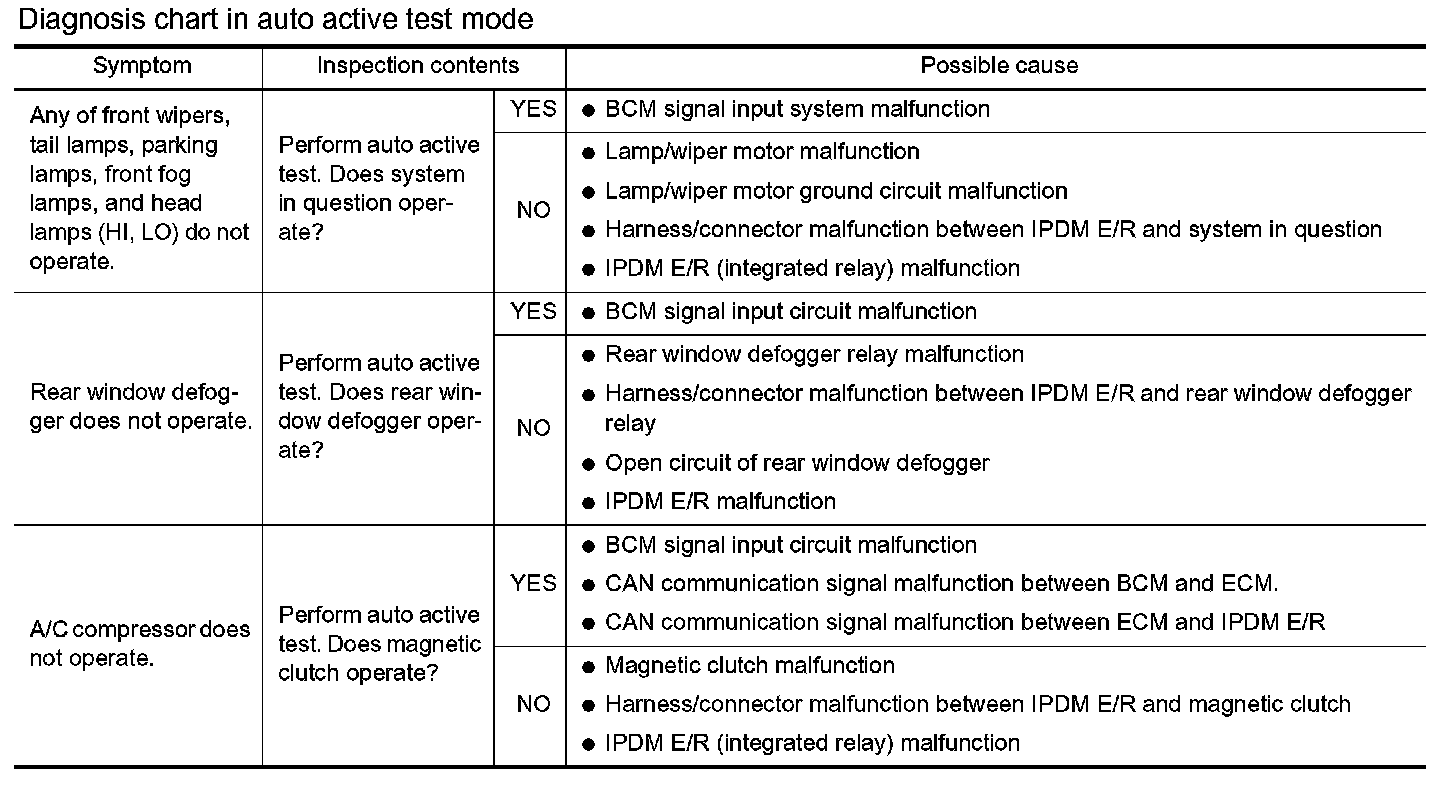 - If any of systems controlled by IPDM E/R cannot be operated, possible cause can be easily diagnosed using auto active test.
