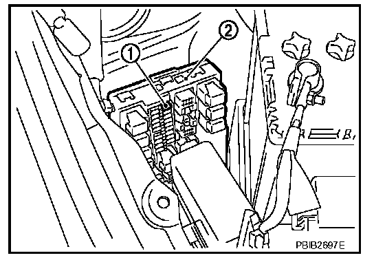 7. Remove fuel pump fuse (1) in IPDM E/R (2) to release fuel pressure.
