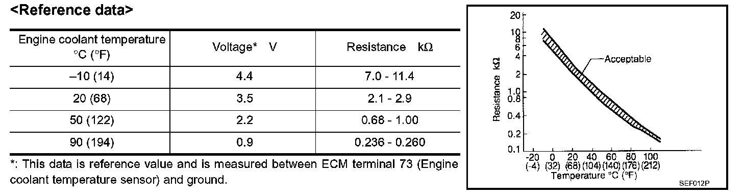The engine coolant temperature sensor is used to detect the engine coolant temperature. The sensor modifies a voltage signal from the ECM. The modified signal returns to the ECM as the engine coolant temperature input. The sensor uses a thermistor which is sensitive to the change in temperature. The electrical resistance of the thermistor decreases as temperature increases.