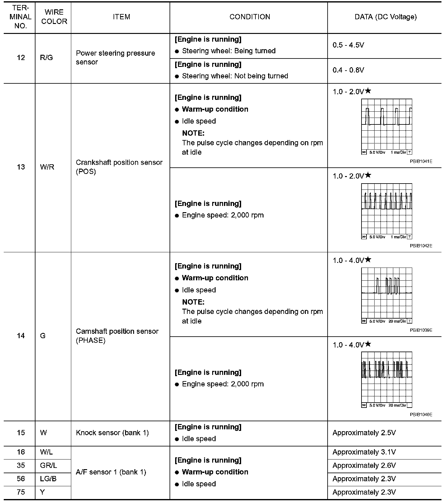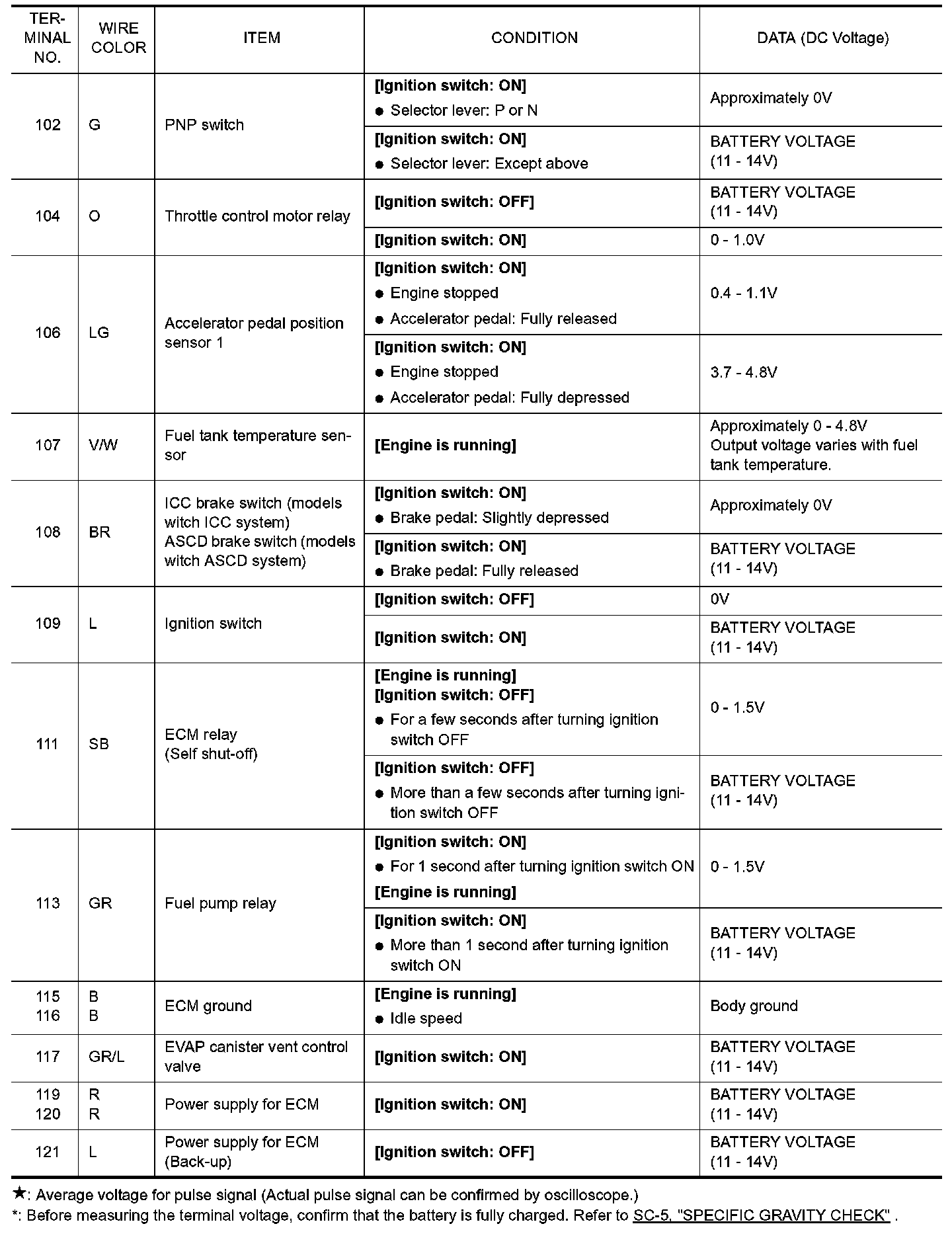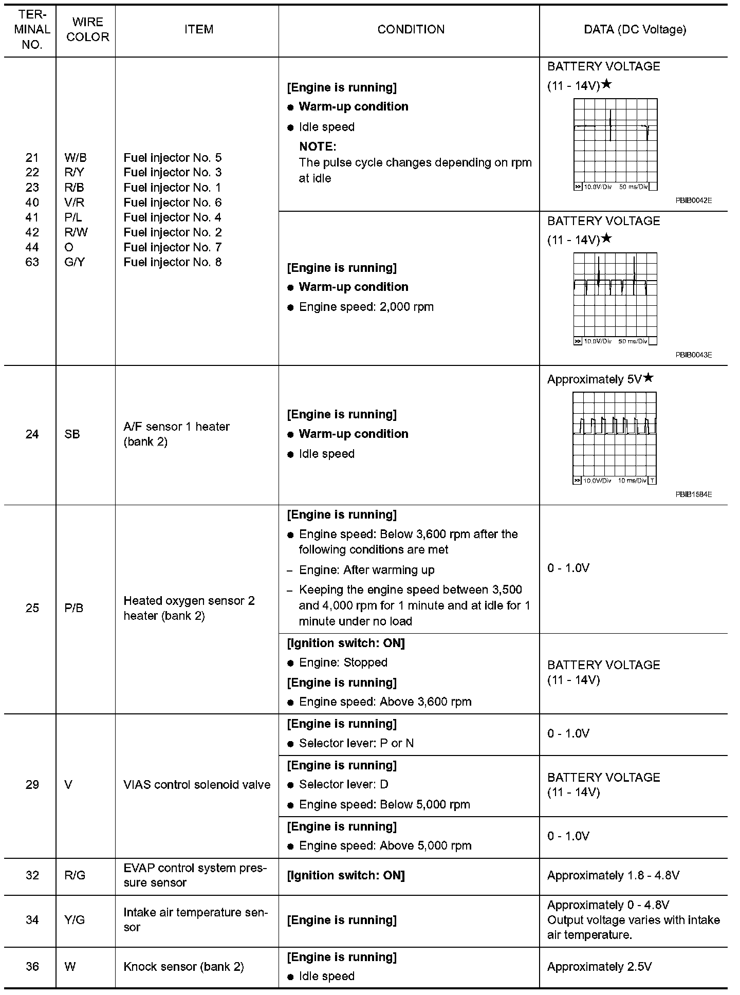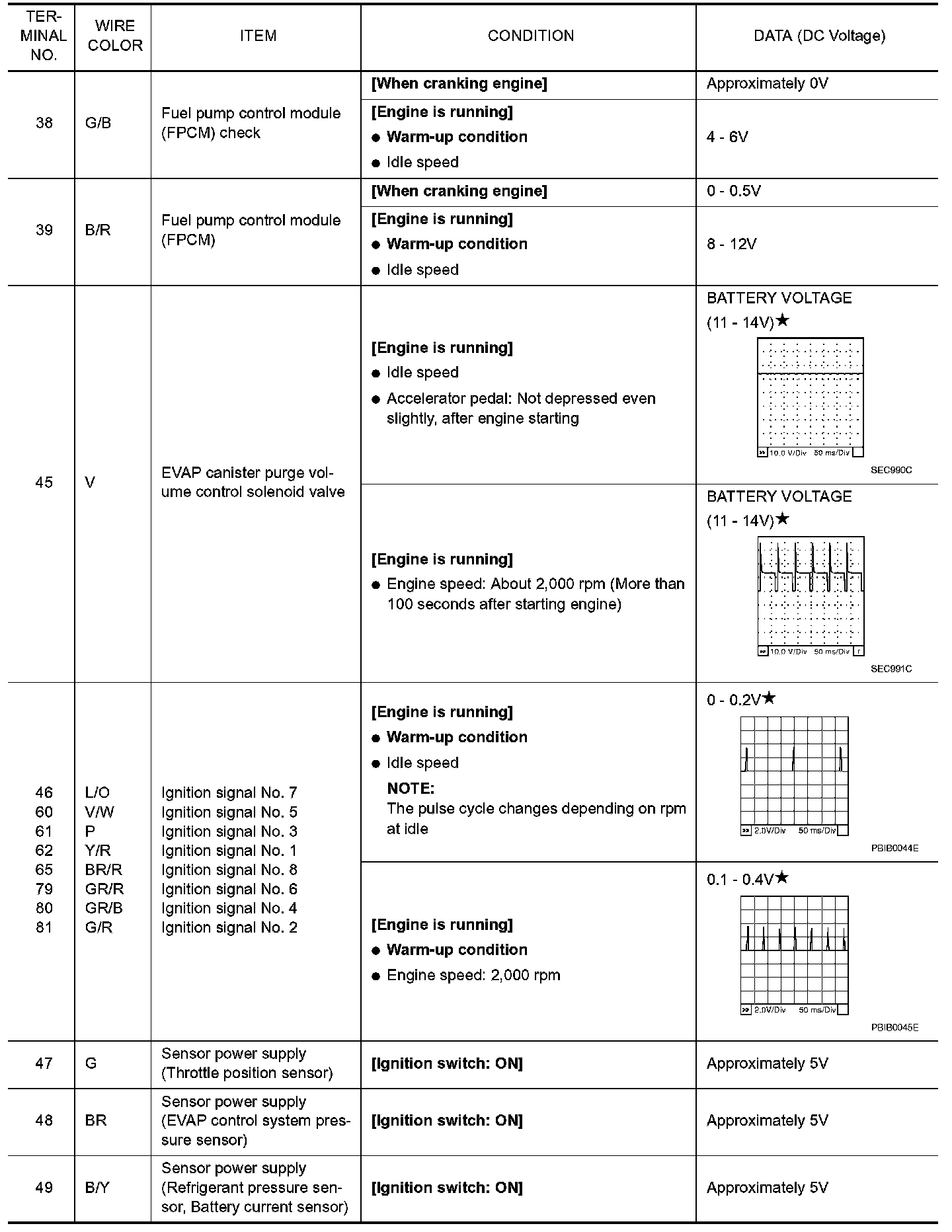 Specification data are reference values and are measured between each terminal and ground. Pulse signal is measured by CONSULT-II.