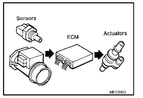 The engine has an ECM to control major systems such as fuel control, ignition control, idle air control system, etc. The ECM accepts input signals from sensors and instantly drives actuators. It is essential that both input and output signals are proper and stable. At the same time, it is important that there are no malfunctions such as vacuum leaks, fouled spark plugs, or other malfunctions with the engine.