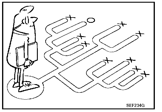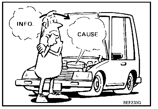 Before undertaking actual checks, take a few minutes to talk with a customer who approaches with a driveability complaint. The customer can supply good information about such incidents, especially intermittent ones. Find out what symptoms are present and under what conditions they occur. A Diagnostic Worksheet like the example on EC-796, "DIAGNOSTIC WORKSHEET" should be used. Example of Diagnosis Sheet