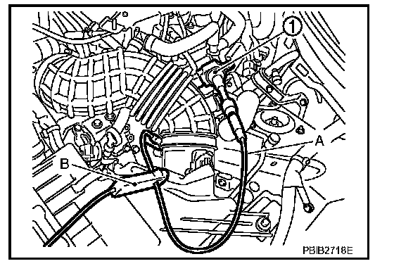 2. Connect ignition coil No. 1 (1) and spark plug No. 1 with suitable high-tension wire A as shown, and attach timing light clamp B to this wire.