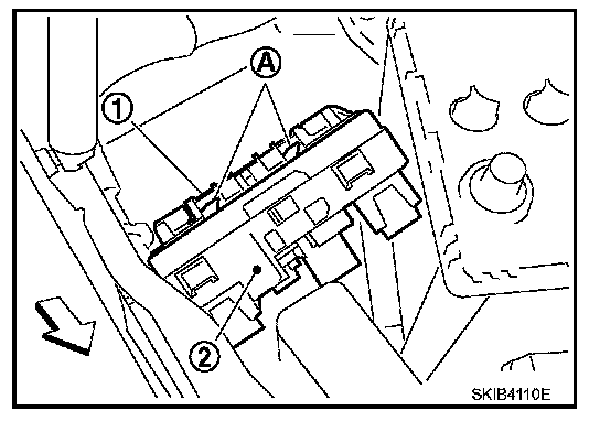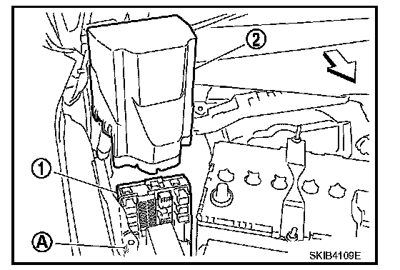 3. While pushing pawl (A) on backside of IPDM E/R cover B (1) toward vehicle front to unlock, lift up IPDM E/R (2).