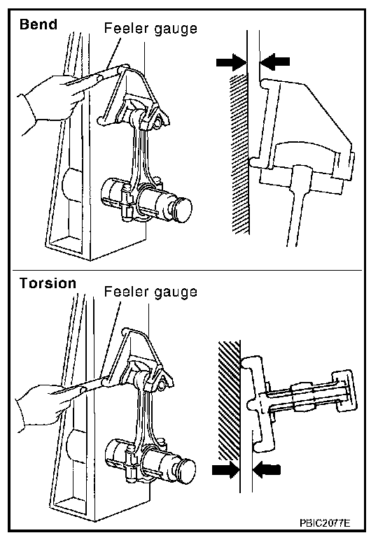 ^ Measure the side clearance between connecting rod and crankshaft arm with feeler gauge.