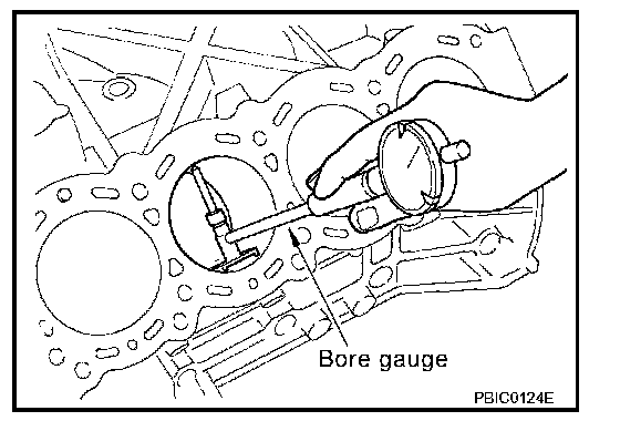 ^ Using bore gauge, measure cylinder bore for wear, out-of-round and taper at six different points on each cylinder. ("X" and "Y" directions at "A", "B" and "C") ("X" is in longitudinal direction of engine)