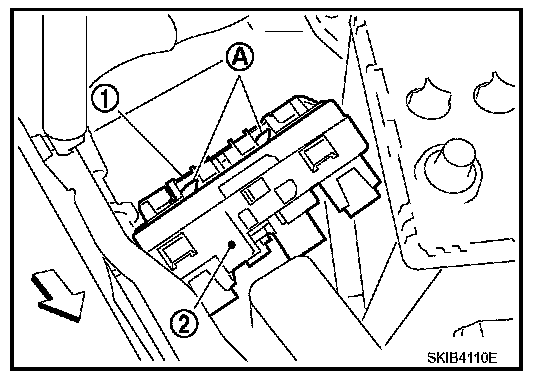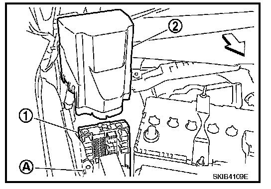 3. While pushing pawl (A) on backside of IPDM E/R cover B (1) toward vehicle front to unlock, lift up IPDM E/R (2).