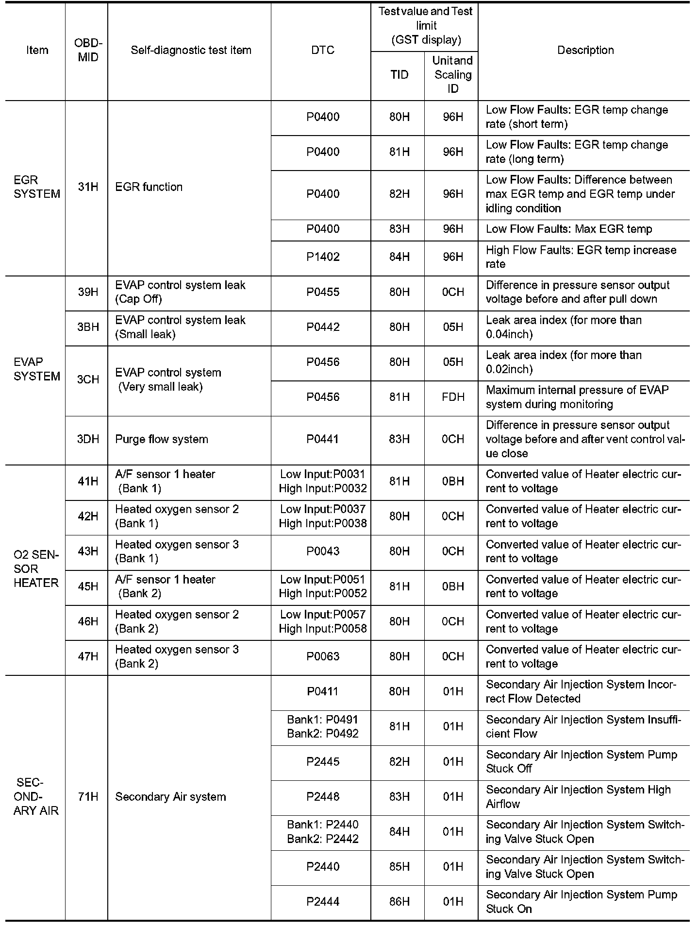 These data (test value and test limit) are specified by On Board Monitor ID(OBDMID), Test ID (TID), Unit and Scaling ID and can be displayed on the GST screen.