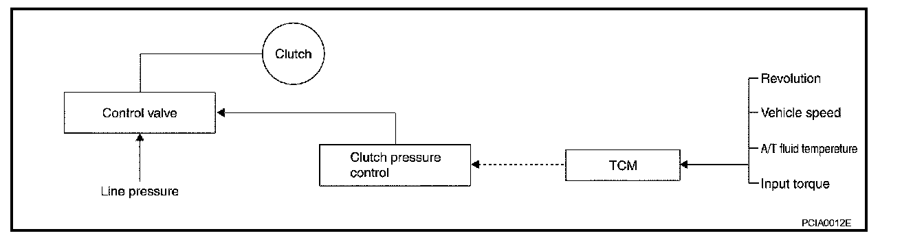 Shift ControlThe clutch pressure control solenoid is controlled by the signals from the switches and sensors. Thus, the clutch pressure is adjusted to be appropriate to the engine load state and vehicle driving state. It becomes possible to finely control the clutch hydraulic pressure with high precision and a smoother shift change characteristic is attained.