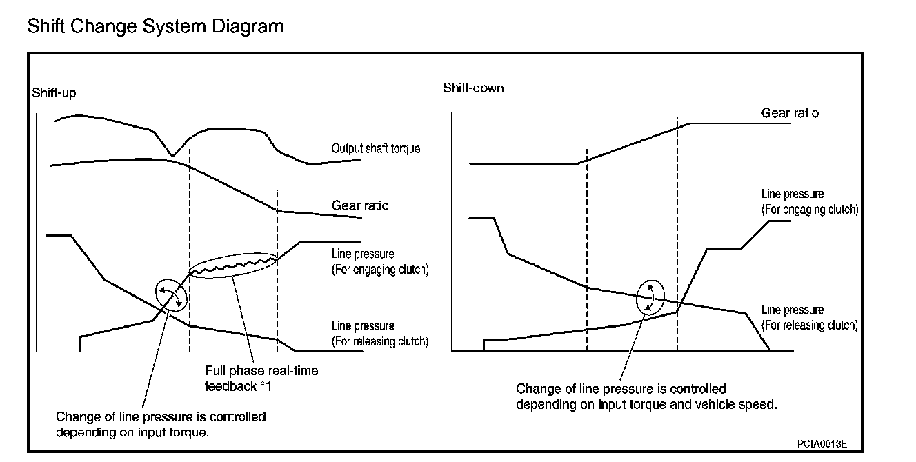 *1: Full phase real-time feedback control monitors movement of gear ratio at gear change, and controls oil pressure at real-time to achieve the best gear ratio.