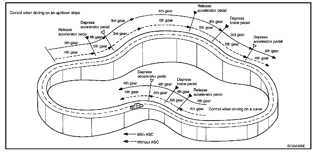 ASC judges up/down slope according to the angle of accelerator pedal and vehicle speed. Holding gear at the 3rd or 4th on an up-slope prevents shift hunting and controls the vehicle to gain maximum driving force. On a down-slope, automatic shift-down to the 3rd or 4th gear controls to gain maximum engine brake.
