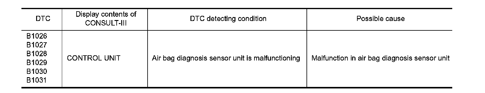 B1026, B1027, B1028, B1029, B1030, B1031 DIAGNOSIS SENSOR UNIT