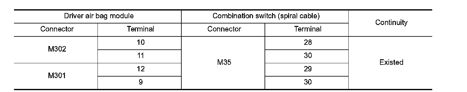 3. Check continuity between driver air bag module harness connector and combination switch (spiral cable) harness connector.