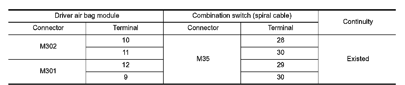 3. Check continuity between driver air bag module harness connector and combination switch (spiral cable) harness connector.
