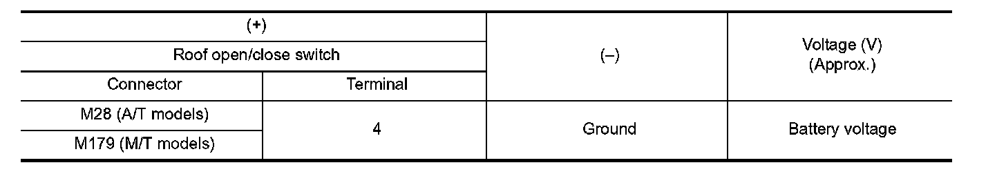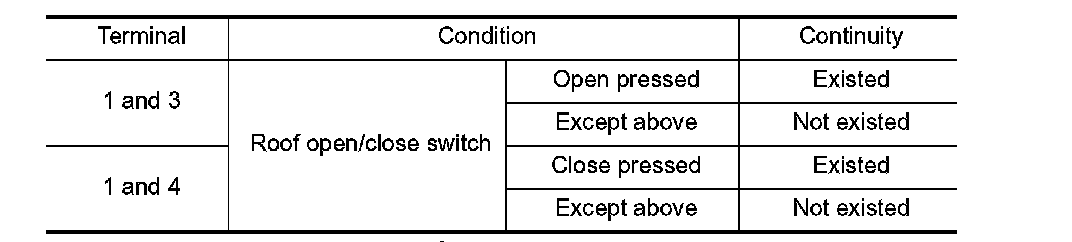 3. Check the continuity between roof open/close switch terminals under the following conditions.