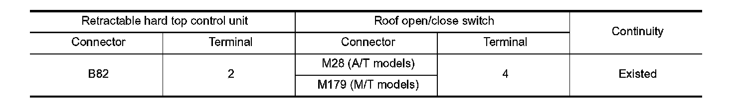 3. Check the continuity between retractable hard top control unit harness connector and roof open/close switch harness connector.