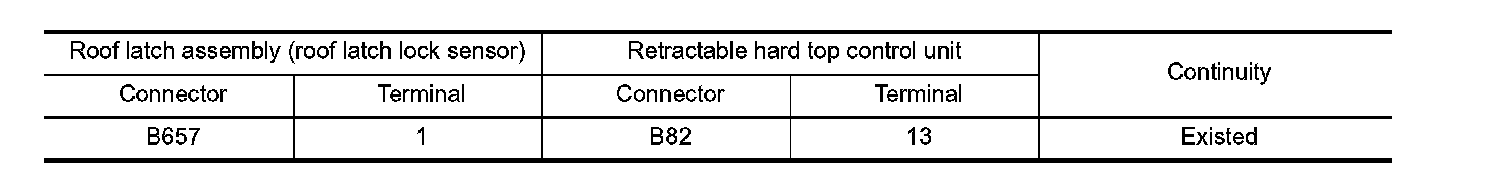 3. Check the continuity between roof latch assembly (roof latch lock sensor) harness connector and retractable hard top control unit harness connector.