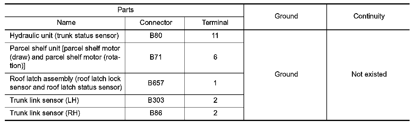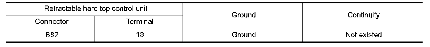 2. Check harness for short to ground (Check the continuity between following parts harness connector and ground, or retractable hard top control unit harness connector and ground).