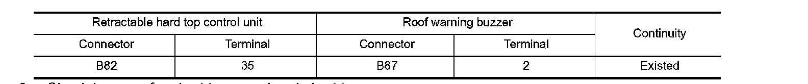 2. Check continuity between retractable hard top control unit harness connector and roof warning buzzer harness connector.