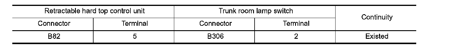 2. Check continuity between retractable hard top control unit harness connector and trunk room lamp switch harness connector.