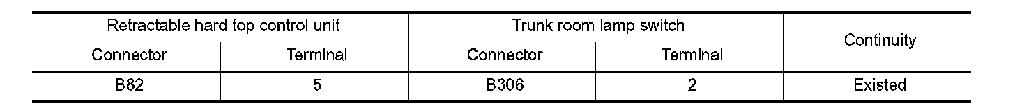2. Check continuity between retractable hard top control unit harness connector and trunk room lamp switch harness connector.