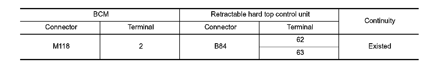 3. Check continuity between BCM harness connector and retractable hard top control unit harness connector.