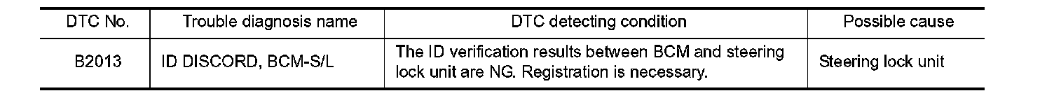 BCM performs the ID verification with the steering lock unit and releases the steering lock if both BCM and steering lock unit ID are same. BCM starts the communication with the steering lock unit when Intelligent Key is carried into the passenger compartment and the push-button ignition switch is pressed.