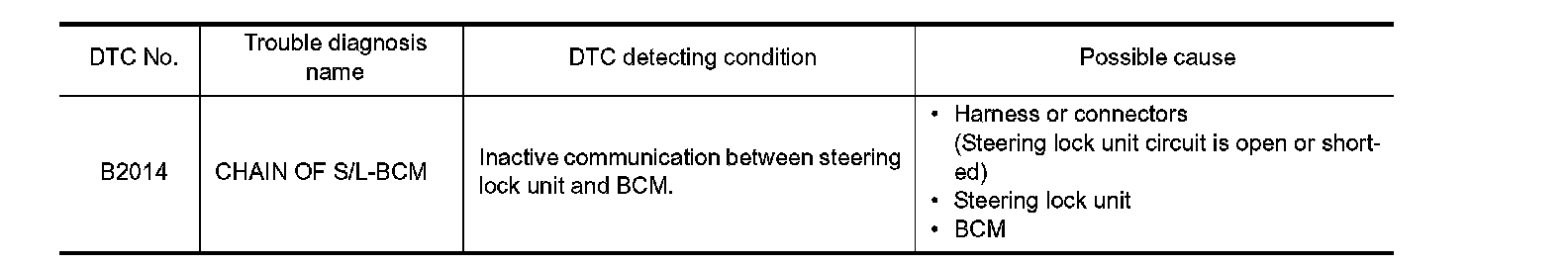 BCM performs the ID verification with the steering lock unit to release the steering. BCM starts the communication with the steering lock unit when Intelligent Key is carried into the passenger compartment and the push-button ignition switch is pressed.